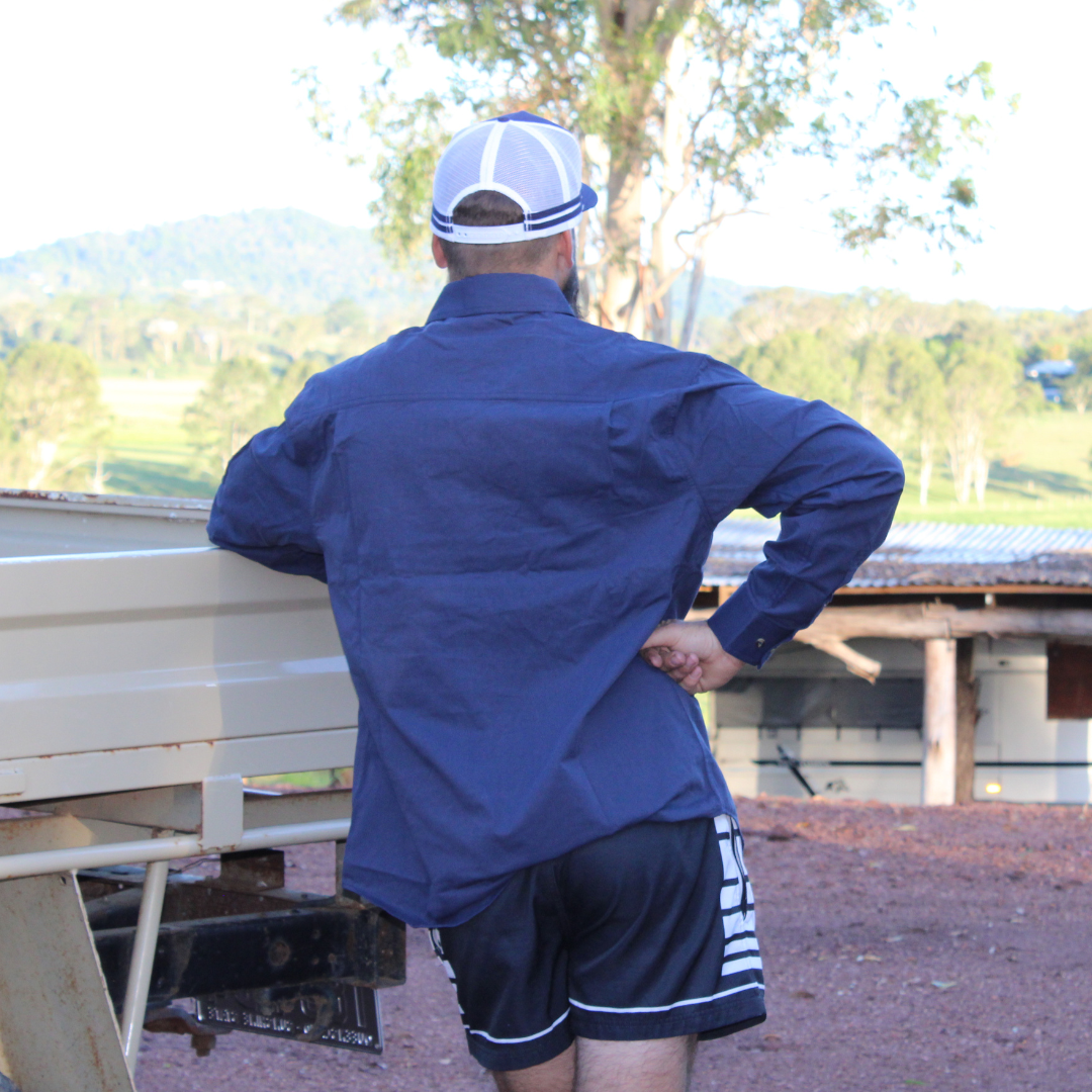 This half button navy work shirt is built from premium double pre-shrunk 100% cotton at 150gsm. Lightweight and breathable with UPF 50+ sun protection (meets Australian standard AS/NZS 4399:2017). Finished with a small Cobba Country Signature logo on the front left chest.