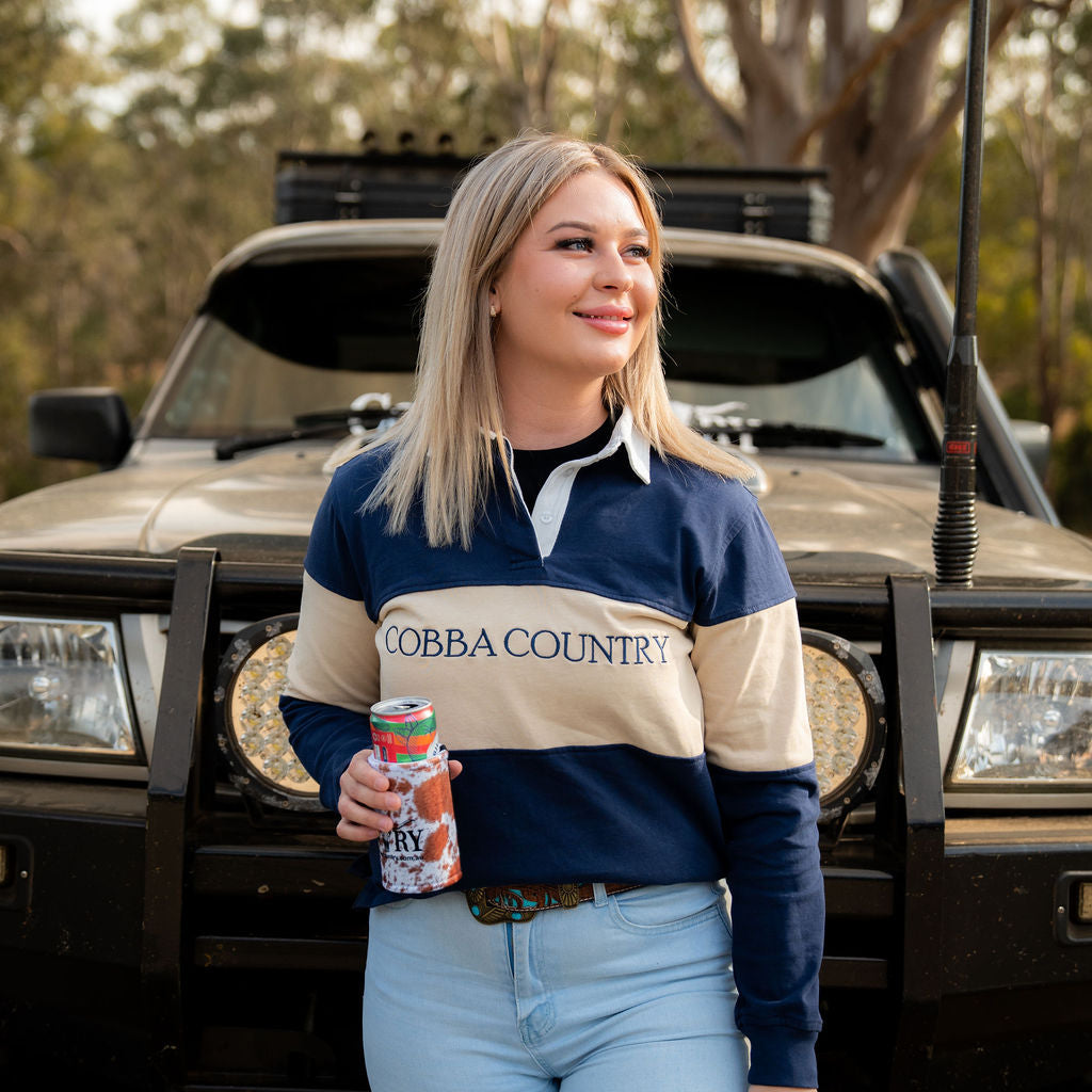 This navy rugby jersey features a tan stripe across the chest and sleeves. Made from 345 GSM 100% cotton, it's soft yet structured with a relaxed fit. Finished with Cobba Country Signature logo across the front chest and again under the back collar.